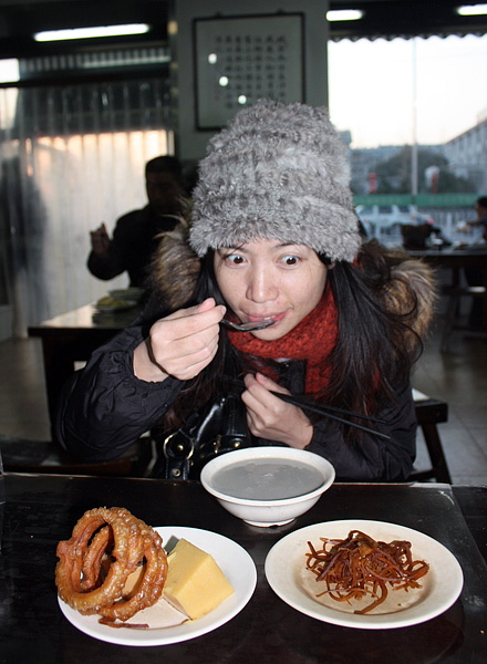 Before I went to Beijing, I have heard many times about one local drink - Douzhir (Fermented soybean milk). Local Beijingers like this drink very much and most of them drink it every day, but people from outside Beijing are not used to it and think it smelly and rancid. Because of this, drinking Douzhir becomes a mark of Beijingers. Anyway, no matter how terrible it is, I decided to have a taste.