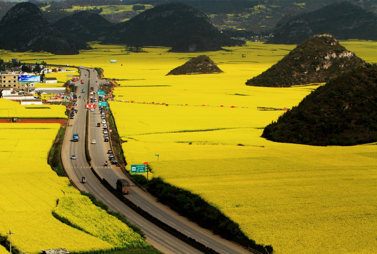 Luoping finds itself about 228 kilometers northeast of Kunming, and locates near where Yunnan meets Guizhou and Guangxi. Here the rapeseed (also named canola) flowers are in full blossom in spring (usually begin in February), surrounding the scattered houses, twisting roads and pretty mountains. This area of rolling hillside landscape thus takes on a “golden ocean" and becomes a photographers’ heaven. Despite its relatively remote location, the small country with its visual spectacle attracts numerous visitors and photographers each spring. The rapeseed farms (with an area of over 13,000 hectares) in Luoping are among the largest scale in China. The best time for it will be February and March.