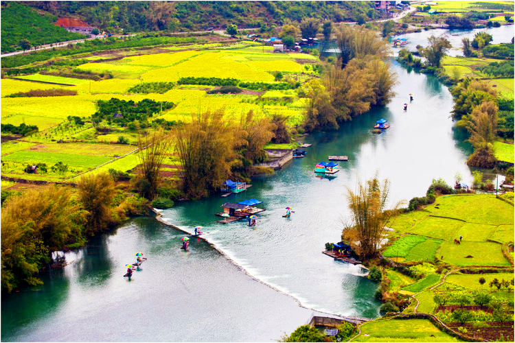 Yangshuo is not all about Karst landscape and Li River Cruise, there are also cozy country life and blooming rape flowers in Spring. The farmlands of rapeseed flowers are not as big as those in Luoping or Wuyuan, but still breathtaking, as they perfectly melt into the idyllic countryside, picturesque karst peaks, flowing rivers and streams. You can rent a bicycle for a delightful Yangshuo countryside tour. Early March is the best time to see rape flowers in Yangshuo, with average temperature being about 15 °C (57 °F). Just bring with an umbrella In case of some rainy days.