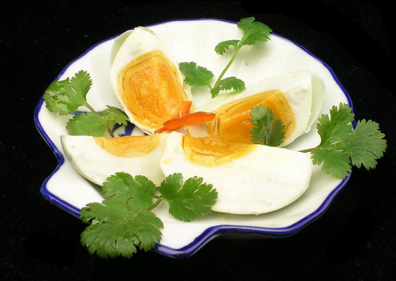 A traditional Chinese food, the salted duck eggs have a soft briny smell, a very liquid egg white and a firm-textured, orange-red round yolk that looks like the crab cream. Tradition has it that it is good to eat salted duck eggs during the Dragon Boat Festival as the burning summer is coming. The salted duck eggs are nutrient-rich and has some effect on the treatment of heat stroke.