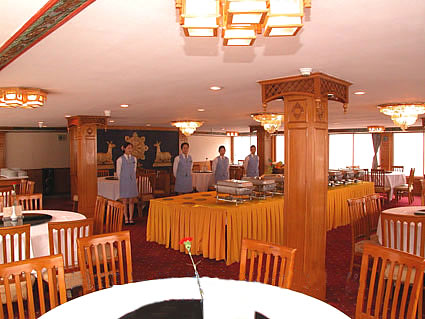 Snow Mountain is another name for President No.5 Cruiser. Combing Tibetan and Han nationality culture and modern arts, she boasts 1 presidential suite, 2 deluxe suites and 49 standard cabins with full capacity of 104.Equipped with central air-conditioning system, IDD, business center, snack bar, nightclub, reading corner, recreation center and ect. In addition, the unique Tibetan Buddha Prostrate Room and Panorama Sky Lounge on board also an ideal place to learn more about Tibetan and its unique culture.